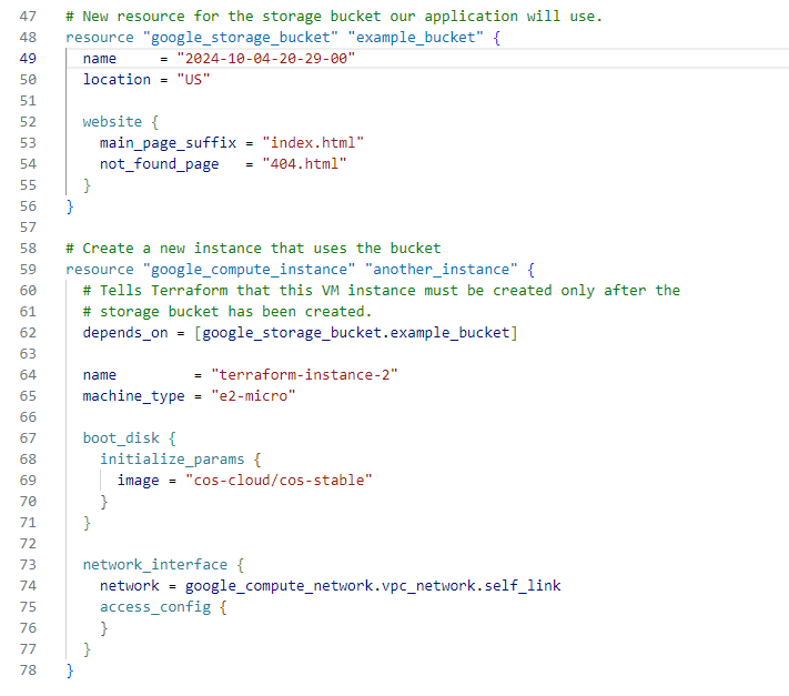 main.tf에 다음을 추가하여 버킷에 대한 명시적 종속성이 있는 Cloud Storage 버킷과 인스턴스를 추가한다.