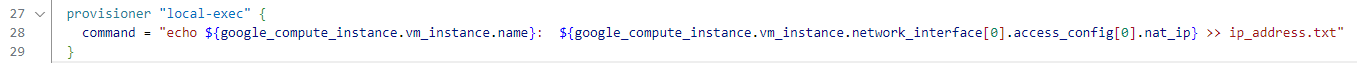 command = "echo ${google_compute_instance.vm_instance.name}: ${google_compute_instance.vm_instance.network_interface[0].access_config[0].nat_ip} >> ip_address.txt"