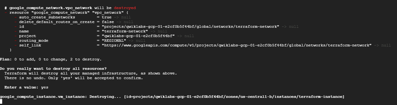 terraform apply와 마찬가지로, Terraform은 리소스를 파괴하는 순서를 결정한다. Google Cloud에서는 VPC Network 내에 리소스가 남아 있는 경우 해당 네트워크를 삭제할 수 없으므로, Terraform은 인스턴스가 파괴된 후에 네트워크를 삭제한다. 작업을 수행할 때 Terraform은 의존성 그래프를 생성하여 올바른 작업 순서를 결정한다. 여러 리소스가 있는 복잡한 경우에는, Terraform이 안전할 때 작업을 병렬로 수행한다.