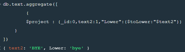 $project : {_id:0,text2:1,"Lower":{$toLower:"$text2"}}