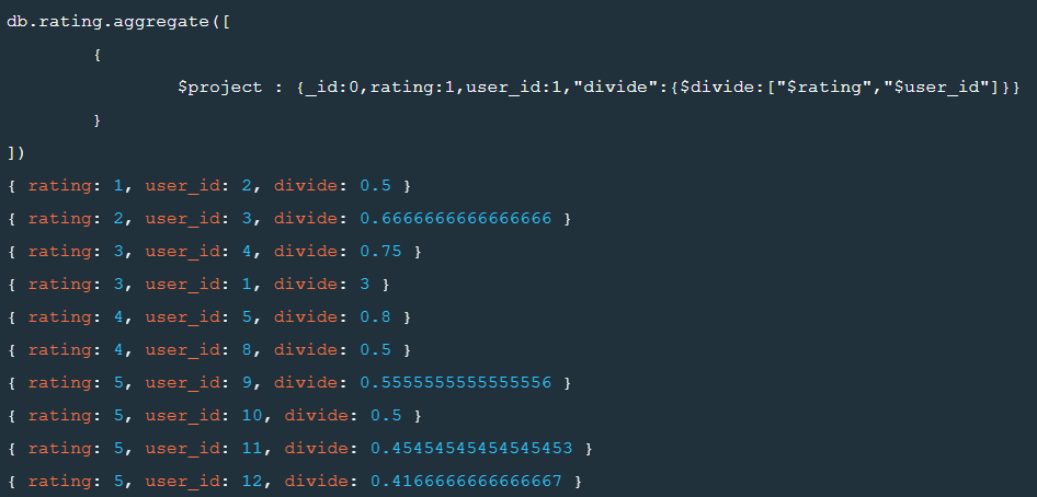 $project : {_id:0,rating:1,user_id:1,"divide":{$divide:["$rating","$user_id"]}}