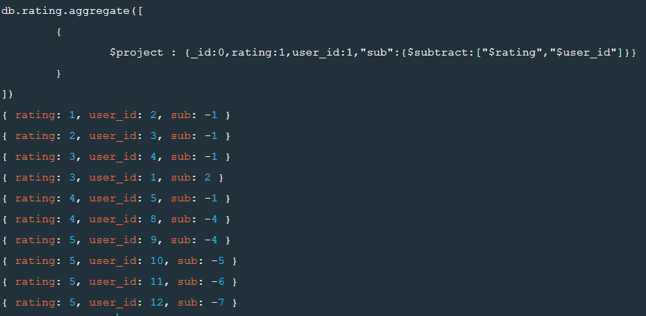 $project : {_id:0,rating:1,user_id:1,"sub":{$subtract:["$rating","$user_id"]}}