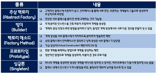 - 생성 패턴은 객체의 생성과 참조 과정을 캡슐화 하여 객체가 생성되거나 변경되어도 프로그램의 구조에 영향을 크게 받지 않도록 하여 프로그램에 유연성을 더해 줌
