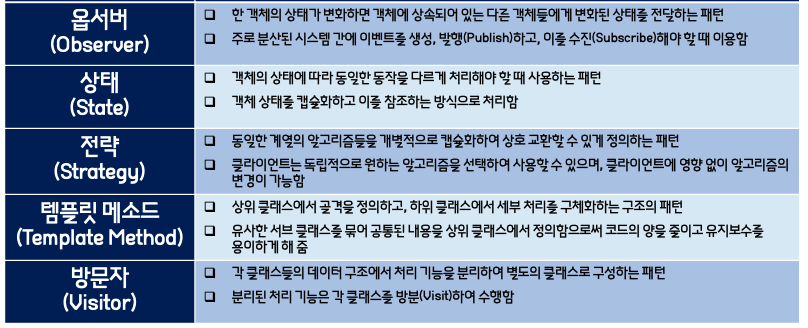 - 행위 패턴은 하나의 객체로 수행할 수 없는 작업을 여러 객체로 분배하면서 결합도를 최소화 할 수 있도록 도와줌