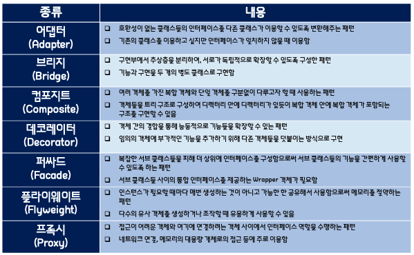 - 구조 패턴은 구조가 복잡한 시스템을 개발하기 쉽게 도와줌