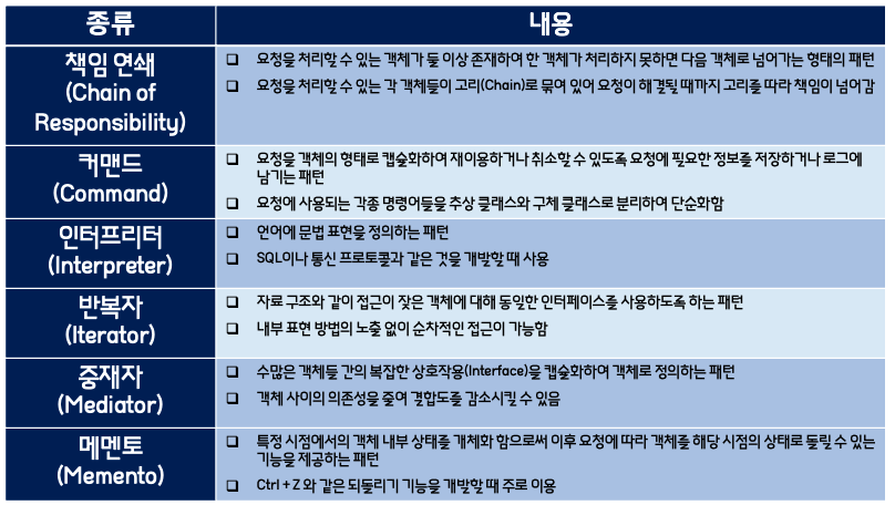행위 패턴은 클래스나 객체들이 서로 상호작용하는 방법이나 책임 분배 방법을 정의하는 패턴으로 총 11개의 패턴이 있음